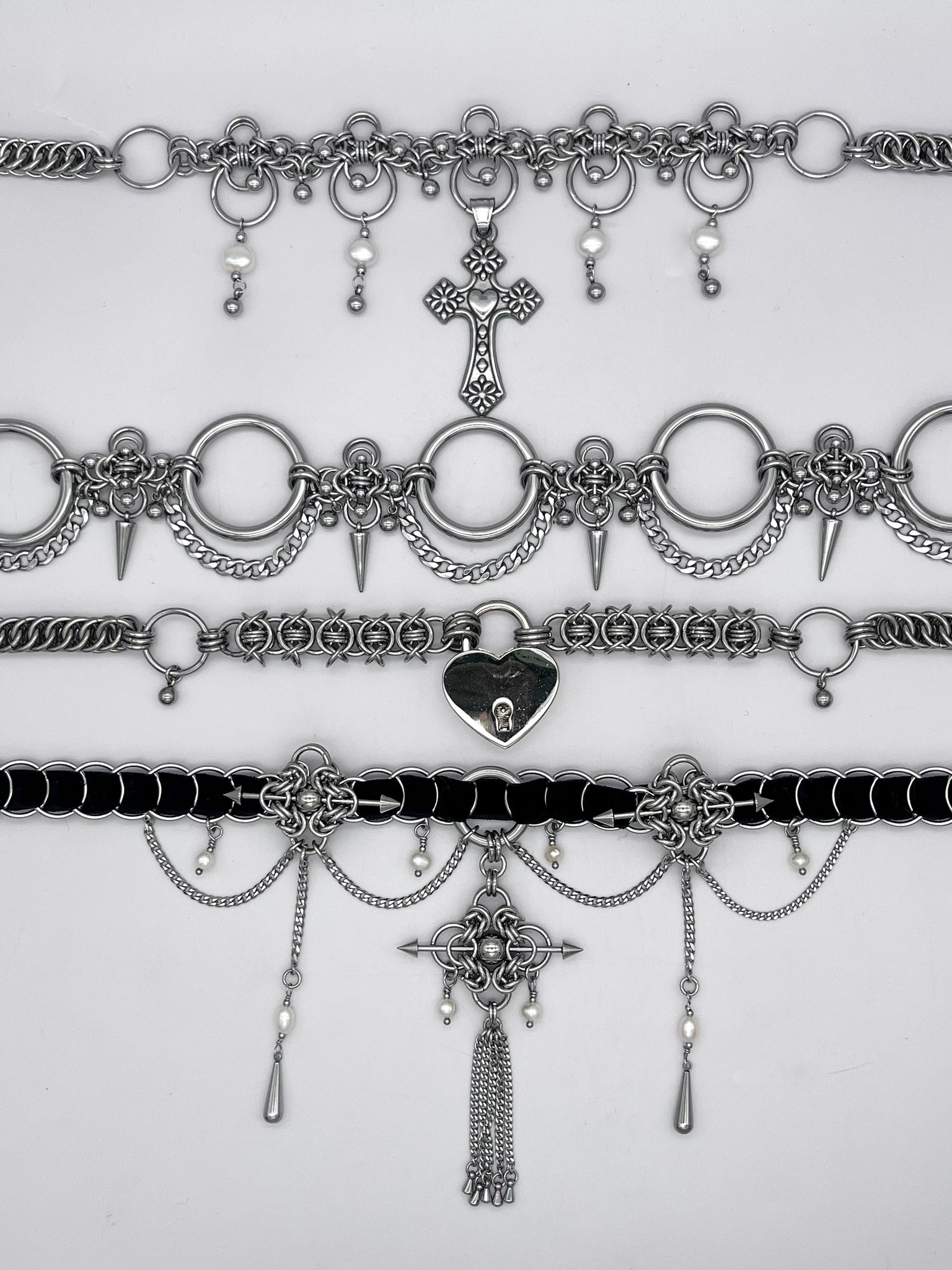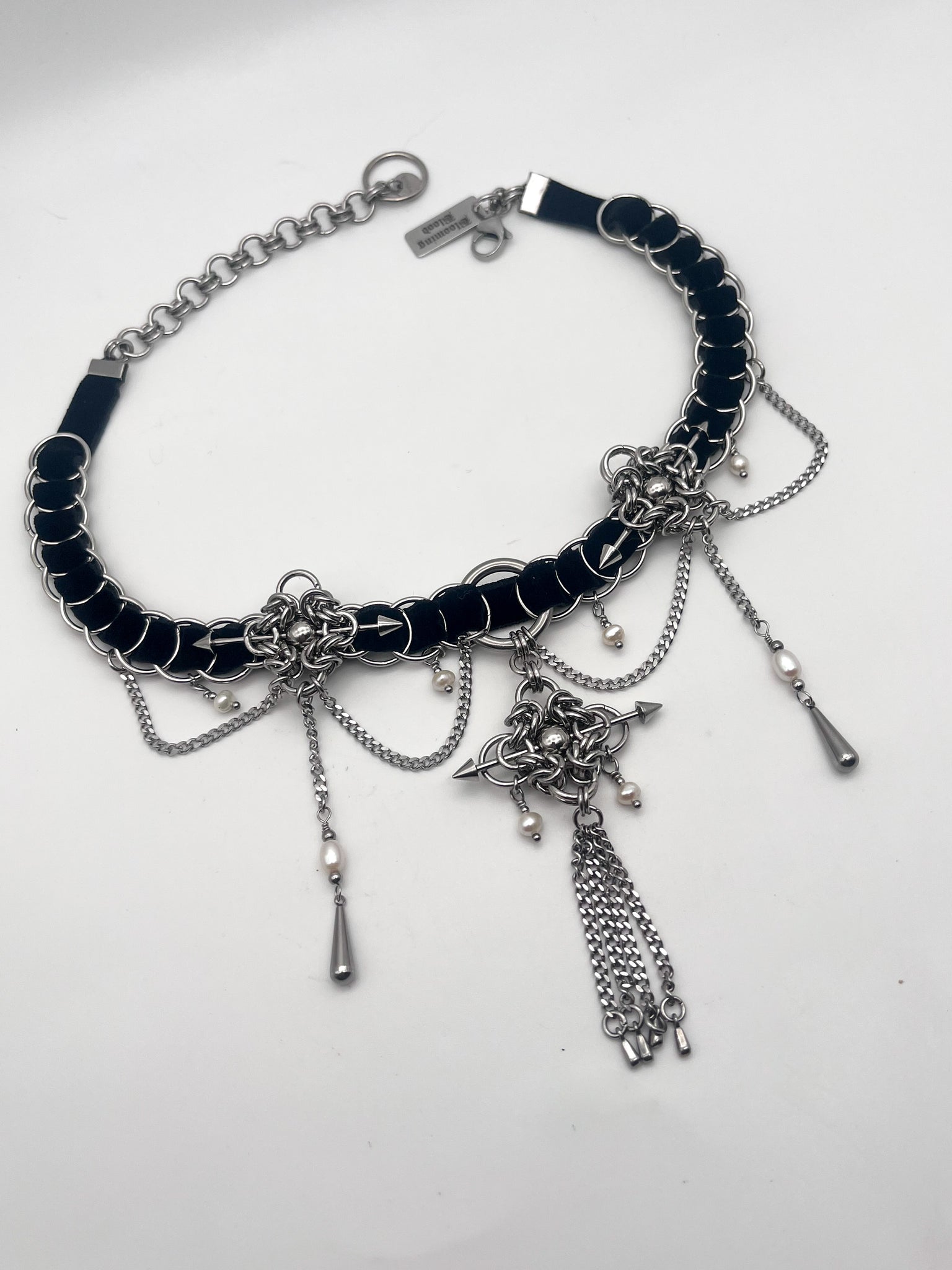 Hand made chain mail choker. Featuring a red interwoven velvet band, hand beaded fresh water pearls, a tassel, hanging chains, and spiked barbels.